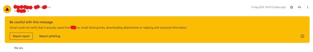 “Be careful with this message. Gmail could not verify that it actually came from. Avoid clicking links, downloading attachments or replying with personal information.“